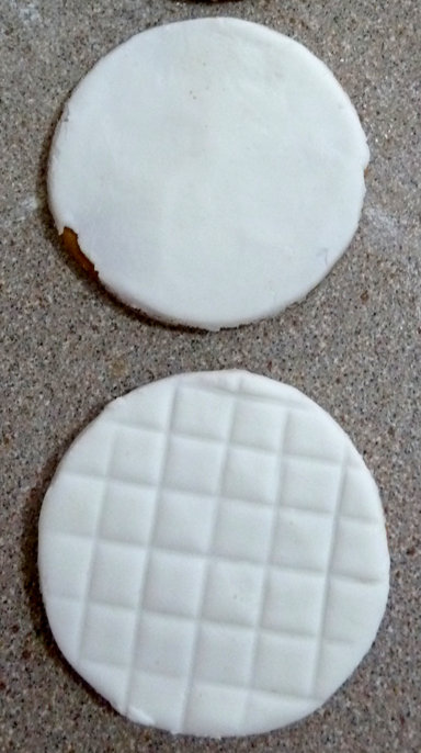 Carefully lift the piece of fondant icing, and press it onto the biscuit. Trim around the edges with the little knife.