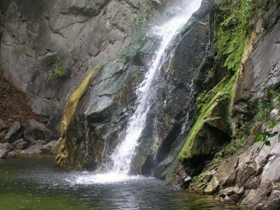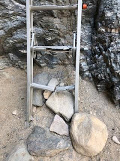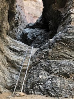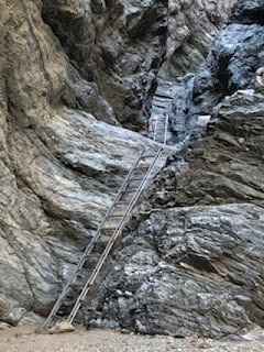 It may be hard to make out, but that's an aluminum ladder leading up a rock face... to another aluminum ladder leading up another rock face. Here's a more close-up view to the first: