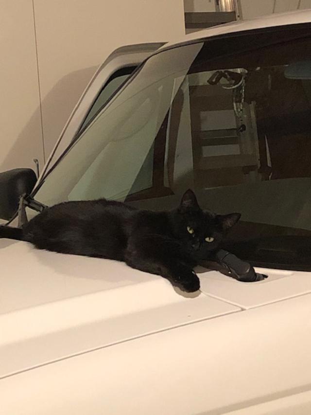 Her favorite activity, though, is finding a new place to curl up and sleep, one I am wholly unaware of, so that when I realize I haven't seen her in a while, and I start looking, I can't find her. I can remain pretty calm for the first ten minutes as I walk through the house, calling her name. (Of course she never responds when she's hiding. Because she's a cat. Sheesh!) After twenty minutes, I get concerned. After thirty minutes I am worried, backtracking in my mind, wondering how she might have gotten out or whether she somehow climbed in before I started the dishwasher. Panic rises slowly in me, but I do get there eventually. One day I finally found her sitting in the driver's seat of the truck in the garage. I'd left the windows down in it earlier, and somehow she'd climbed in and gone to sleep. Another time, after I'd searched every hidden corner in the house and under all beds and inside every cupboard three times, I happened to walk through the living room and I saw the fringe on a throw blanket move, almost imperceptibly. I lifted it. Yep, sleeping cat underneath. Several nights ago I couldn't find her, so I headed out to the garage to see if she'd climbed into the truck again. Didn't have to look that far. She was asleep on the hood, up on the vent. I'd driven the truck to pick up the mail earlier, and the engine was still warm.