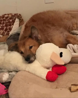 Most days he is active and happy, and he has gone from barely tolerating my bedtime routine of petting and singing to him to eagerly anticipating it--so much so that, as soon as I begin my flossing and brushing routine, he camps out on the floor just outside the bathroom door, ears up and waiting for his ear scratch + back massage + belly rubs. Spoiled? Yes, absolutely. I can't begin to imagine the horror of his life before, having to scrounge for food and water in the desert, being literally eaten alive by mange--not for days or weeks or months, but years. Oh, my poor boy! But he's safe now. And hopefully, I have a few more years to spoil him.