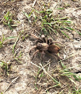 You might have to peer closely to see her, but she's a lovely, light-colored tarantula, probably a "desert blonde tarantula." (I'm assuming female, as they live much longer than the males, but I could be wrong.) Generally, they hunt at night and remain burrowed during the day, so I'm not sure what was going on with this gal (or fellow). We sometimes see them when they migrate in August. I've never seen one in early spring before, so this was quite surprising.
