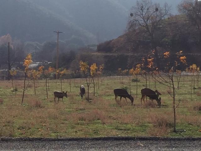 Some weeks ago I needed to take a run up to Forest Falls (a small mountain community about a half hour’s drive from me) as I needed to purchase an annual Adventure Pass. (It’s a parking pass required for many mountain areas.) I also needed a gift for someone, so I went the long way, driving first to the little town of Oak Glen where apples grow. I bought some lovely jam and a cup of coffee, then climbed back into Sky (the Subaru) to head for the mountains. As I left Oak Glen, however, I was surprised to see an entire herd of deer lounging about in one of the apple orchards. Mind you, I’m in Southern California. Most folks don’t see deer very often. When I see them, it’s only when I’m wandering the hills. The most I’ve seen is five. I counted a baker’s dozen in this group. Sorry the photo below is dark and grainy, but it’s the best I could do while pulled over on the opposite side of the road trying desperately not to get hit by other drivers flying past me at breakneck speeds.