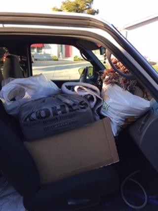 Twenty-four hours later, I was close to the fifty-blanket mark I'd been hoping for. People dropped off bags and boxes of blankets on my porch. A few commented their space numbers, and Thomas and I took a happy drive around the park, picking up blankets and also receiving a hug and a helping hand. (I was struggling with a huge box of blankets and a new resident happened to be walking by. "Do you need help with that?" she called. I had no idea who she was; we'd never met. Now I know her name is Carla and she is very kind.) In two days, we managed to fill the bed and passenger seat of Cloud (my truck) with blankets.