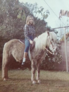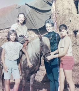 Peg is in the saddle, and I'm the smiling geek in the blue shorts. That's Mom, of course, looking fashionable as always, and our next-door-neighbor (looking jealous). I apologize for the quality of this photo; we had it stuck on the wall in the tack room for years.Our pony, a purebred Shetland, was named Silver Lady Sensation on her registration papers. We called her Silver. I say "we" because the colt she gave birth to was later traded for a full size horse for my sister, so the pony was passed down to me. Like a big dog, she was my boon companion from the time I was ten until I was twenty-six.