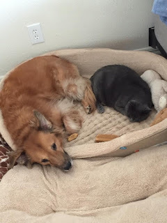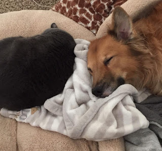 If you’re a longtime blog follower of mine, you’ve read updates on how this once-feral dog has slowly been rehabilitated, learning to accept and trust humans (and cats). But I haven’t posted an update on Thom for a while, so I thought I’d let his fans know, he’s continuing to make progress—yes, even five years in.Most notably, in the past year, he has finally given in and accepted Purrl as his buddy. She was a young cat, seven months old, when Thomas came to our home. Each night as I sat beside him, brushing him and singing to him, Purrl would creep to the doorway and glare at him. I’m not sure she’d ever seen a dog before. As time went on, she would belly crawl closer and closer to him. But if he so much as twitched an ear, she would shoot out of the room. At some point, though, she realized he posed no threat, so she set about to be his best friend. And boy, that girl kept working on it, rubbing up against him whenever he was captive on the leash, often trying to lie beside him in his bed, only to rebuffed again and again and again. Love is patient….