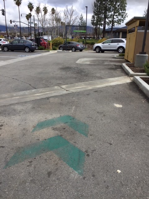 If you look at the photo above, you will see the somewhat faded green arrows indicating the route cars are supposed to follow to access the drive-thru at the Calimesa Starbucks. And if you look closely, you'll also see a long line of cars not entering in the prescribed way but rather from the Walgreens parking lot. Actually, you can't see all of the cars lined up for the drive-thru in this picture, because the dumpster hut blocks the view. But on the day I took this photo, there was a line. (You can trust me; I write stuff, and we all know that if you read something online, it's the absolute truth. Ha ha ha ha ha ha ha.)