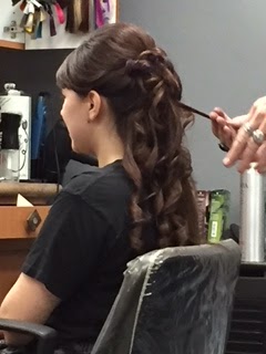 Oh my goodness, this man did magic with her hair! In an hour and a half, he had the extensions in (which matched perfectly with the purple ribbon we'd purchased to replace the dingy gray one on the silver dress) and her hair pulled back and in curls that looked like a cascading waterfall, the purple strands woven in and out throughout.