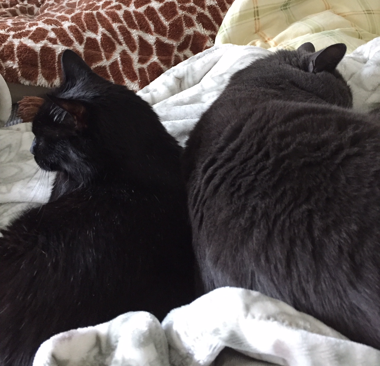 She settled in just as quickly at home (after hiding behind the dryer for a couple of hours). From the first night, she jumped on the bed and slept by my feet, just as if she'd always enjoyed the comfort of human companionship. She and Boo had a conversation about who slept where, but it didn't last long, and there was plenty of room for all of us.