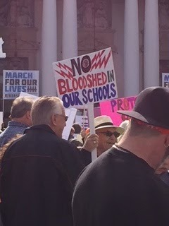 As was the case with the March for Women in January of 2017, I really had to push myself out of my comfort zone to make the drive and find parking and wander alone toward the courthouse and stand alone (until Ben and his crew joined me, which was a special blessing) and then walk. I'm not a shouter or chanter. I'm really not much of a verbal person at all, preferring to select my words and construct my sentences with caution and care, which writing allows me to do. But desperate times call for desperate measures, and so we must all stand with, walk with, the children and adults who have survived mass shootings. Change will come, carried along by the fervency of these young people. I want to say I participated, even if it is in the smallest way. #NeverAgain.