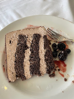 Lunch—wasfantastic. Great food, a terrific chocolate mousse cake, which we debated aboutgetting because, with the dog stop in the beginning of our journey, it wasgetting on toward afternoon, and we knew we had to beat the traffic home, butonce we ate it, we both agreed it was worth sitting in traffic for. Little didwe know....