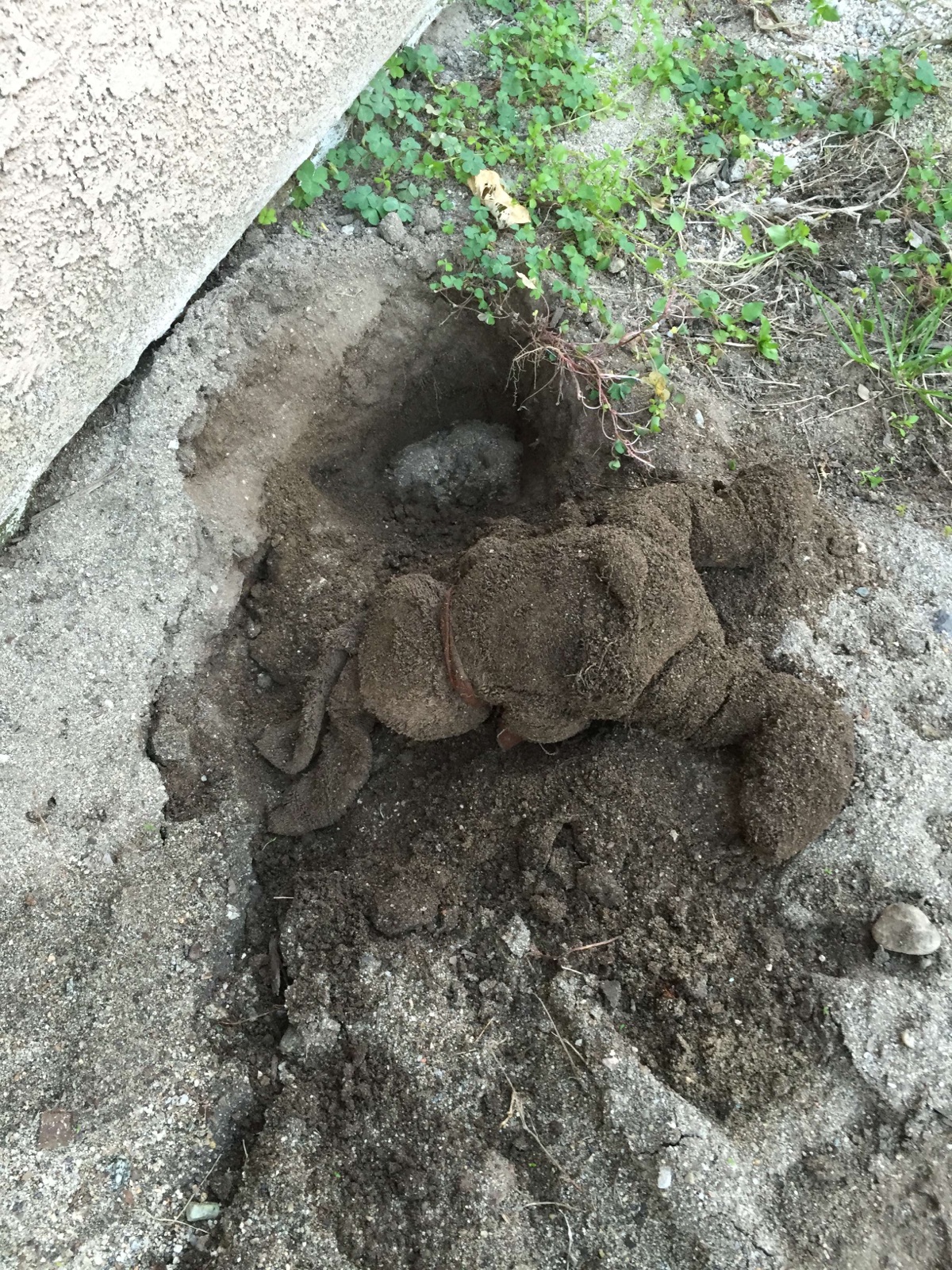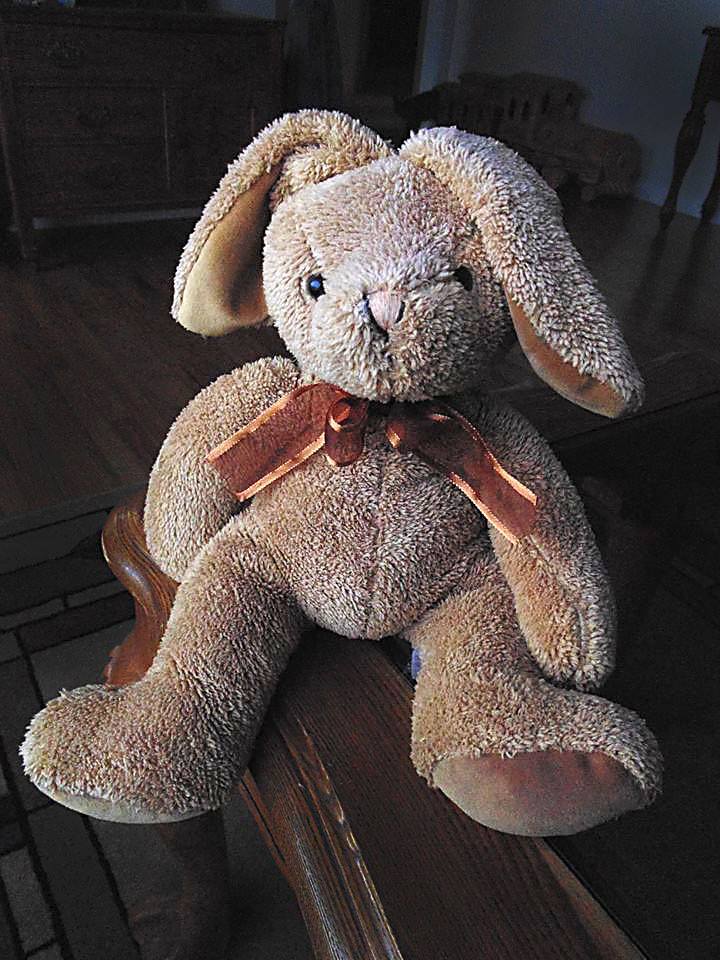 If you haven’t followed the saga of Sgt. Thomas Tibbs’ favorite companion in the world (after me, I’d like to hope), click I don’t know what happened last spring to make Thomas feel threatened, but something kicked his hoarding inclination into overdrive, and I realized one day that he had buried not just Bunny, but every plush toy in the yard. (Currently, he has six inside buddies and four or five outside buddies—I’ve lost count because I can’t remember who’s buried in the yard.) And he buried them so deep, I couldn’t find any of them. Over time, he dug up every one of them—except Bunny. When she didn’t appear after many weeks, I went looking for her one day, digging up each one of his holes. (I did this in the late evening using a flashlight, after Thom had gone to bed in the house, so he wouldn’t know what I was doing. If you think it might’ve been a bit creepy, looking for small lifeless bodies by digging quietly in the dark with a hand spade, you would be correct.) Alas, I never found her.