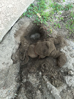 With the heavy rains this past week, I thought we had lost Bunny forever, that she would be entombed in mud that would dry around her, incasing her forever and eventually degrading her lovely soft self. But no! The rains unearthed her, much to my glee. Or at least partially unearthed her; I actually went looking for yet another plush toy Thomas had buried (in the mud) the day before, but when I began digging, a long slender ear emerged. Poor Bunny had been buried for so long, a weed had actually grown through her foot. If you look closely at this photo, you might be able to see it: