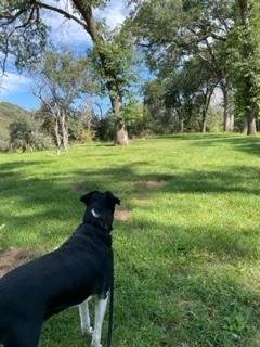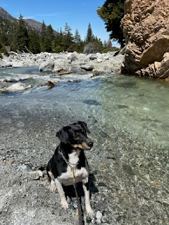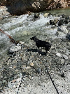 However—wecould still walk along the creek, which we did. (Click here to see a bit of that.) Until she saw people. Too manypeople. There may have been a total of five or six at various points along thestream. But for her, one human (besides me) is too many. So she panicked. Whereto escape?? Into the water. She headed straight into the stream and would havepaddled to the far side had I not reeled her back in. (When we hike, she’s on afifteen-foot lead, so she really did get pretty far before I wrangled hercloser to shore.)