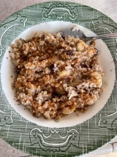 Turnoff the burner under the oatmeal and add raisins, dried blueberries, bananaslices, cinnamon, and brown sugar.