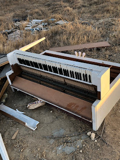 I think I know my sister well enough to know that if she's reading this, she's making an "Are you kidding me?!?" face if not saying that out loud. Yep. Sad. Someone had no use for Grandma's little white spinet piano, so they drove it out to the hills and pushed it out the back of a truck onto the ground. I've seen a lot of things out in these hills, but this just broke my heart. I thought of three different places it would have fit in my little house. Damn, people. You didn't have to toss it out like some kind of garbage.