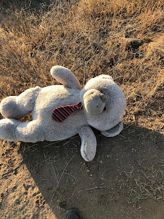 Sad, huh? When we came upon him, his tie was askew, so I fixed it. Then, because Maya was just happy to be out in the hills, and she was willing to wait patiently, I sat him up so that instead of staring at the sky all day, he could see some sky and hills, birds and coyotes, maybe some dirt bike or mountain bike riders (I imagine the latter stopping to chuckle and take a photo), and possibly some more miscreants offloading junk they can't be bothered to drive to the dump.