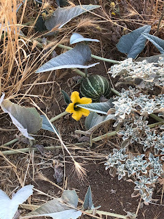 I guess I'm glad the drinker(s) left all the empties in the box. I mean, they could have smashed them against the tree, creating a dangerous hazard for wildlife. Just to note, that box has been there a long time. Maya and I have passed it often. No, I haven't picked it up to carry it out. It's a mile in on the trail, and I have both hands full handling Maya on the way back to the car. And my phone, if I have to take a picture. Case in point, this lovely gourd and blossom: