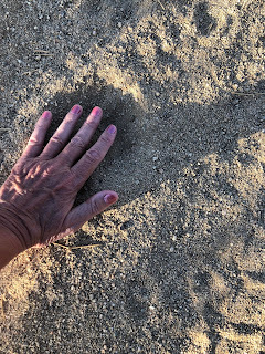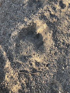 After we saw that, we saw this. If I didn't know better, I'd say it was a bear print, but there are no bears out there. Just, apparently, tremendously huge dogs. I held my hand over it so you can see how big it really was.