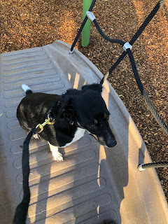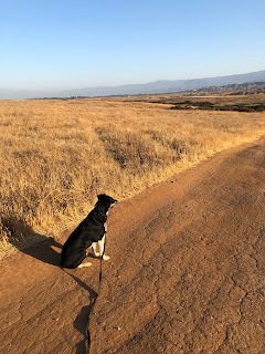 I took Maya to a very large dog park. I used to do this with Thomas from time to time in the first years after I adopted him, take him to a dog park very early in the morning when no one else was there, then let him off the leash just to see if he would come back to me. Nope. He'd trot away to the farthest corner, then huddle against the fence. I knew if he ever got away from me, he'd just take off. Not until I'd had him nearly three years, and I'd retired and had much more time to spend out in the hills with him did I finally trust him to be off leash. Sort of. One day on a hike, descending a steep hill as we made our way back to the truck, I simply unhooked his leash, and he stayed right behind me, picking his own way down. I was very, very proud of him that day, as he stopped and waited when I asked him to so that I could hook him back up. But he has always felt safest when he's connected to me, so that's the way we keep it most of the time.