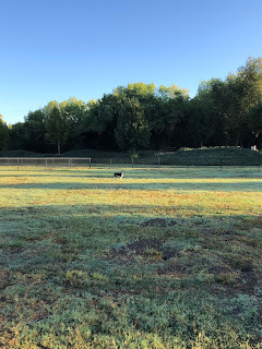 That black and white dot, center of the pic, is Miss Maya Angelou Murphy, off leash. As soon as we were in, I unhooked the leash, and off she trotted. Away, away, away, almost to the back fence. I didn't follow. I just waited. Finally, she stopped. Turned back. I walked to the middle of the park and stopped. She doesn't really know the come command. But she knows "Wait." So I gave her the hand signal and told her, "Maya, wait." And she did. She sat her sassy derriere down and waited for me to approach her. I petted her--something that she never used to let me do if it were outside the confines of her crate, but she has decided, in recent weeks, it's actually quite nice. So she got some pets and head rubbies, and then I said, "Let's go," and we walked around the expansive park some more, Maya sniffing and peeing and being a dog. Pretty fabulous. Of course, I had to stop for a while and wipe the tears off my face and blow my nose. This is huge progress for her. She's learning to trust, and I know, with everything she experienced in the past, humans have shown themselves absolutely untrustworthy. (I hear ya, girl.) But she's trying.