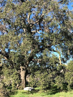This time, we took a side road she has always wanted to take, which brought us up to a ridge, which then took us down a slope and along a little used, mostly overgrown path. From far off, I could see a giant oak. It wasn't until we got close--until I'd decided to try and get a picture with my phone that would show how massive and old and beautiful the tree is--that I saw the mattress lying beneath it.