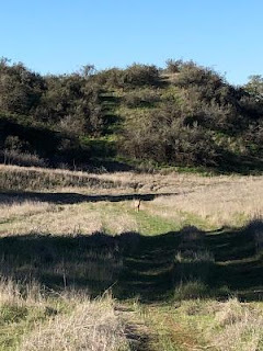 Unless you have the means to zoom in. But she's the brown dot in the center of the green swath. Trust me, she looked very big as she stood there and stared at us. Maya did not react, other than to look, and she sat down to wait patiently again when I pulled my phone out to try to get a picture. Ms. Coyote (Wiley's wife?) didn't move a muscle until I said, "It's okay, 'yote, we won't hurt you," at which point she spun around and trotted away (which is when it became possible to detect her gender). I love seeing wild creatures looking healthy in their own habitat. It gives me hope for the world.