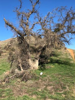 My first thought, of course, was "Stupid jerk." Since there are ways to access the hills if you have a 4WD vehicle and a little gumption, certain types of people will drive to some far corner out there and drop loads of crap--after a remodel, say, or after cleaning the junker car parts out of Grandpa's shed. And yeah, the occasional discarded mattress shows up. But... not usually so strategically placed. I mean, if you're just dropping it, why not push it out of the bed of the truck next to the road? Why drag the unwieldy thing all the way over to the tree? Unless....