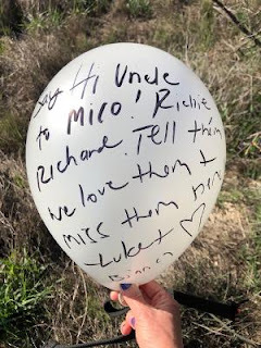 Ah. Someone's uncle had passed away, and at the memorial service, loved ones wrote on balloons and then released them. As much as I love the image of this--all those white balloons being released into the sky simultaneously and gracefully floating toward our perceived notion of heaven--I hate when people do it. Directly east of my little 55+ community--conveniently located--is a cemetery. So my balloon discoveries are frequent, sad to say. Which means lots of trailing ribbon that doesn't bio-degrade for a long, long time. And I can't always be out there, cleaning up the woods.In this case, though, I made the decision to leave the balloon. The truth is, it wasn't practical; I didn't have my backpack with me this time (because I had Maya), which meant I also didn't have a knife to cut the ribbon, nor did I want to terrify my little dog by popping a balloon. And besides, the family was hoping that "Uncle" would read their message. It seemed as though it had been recently released. Maybe Uncle hadn't finished reading all the messages yet. Who am I to say?