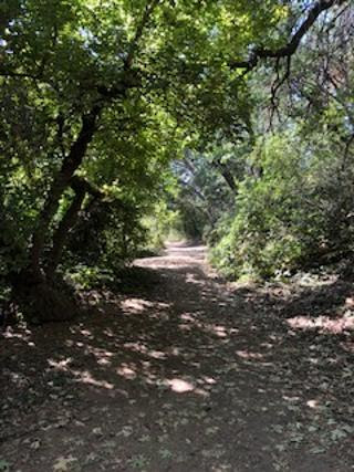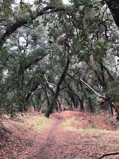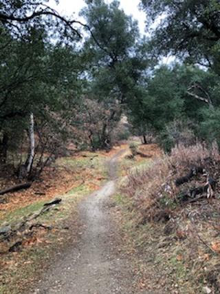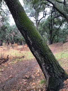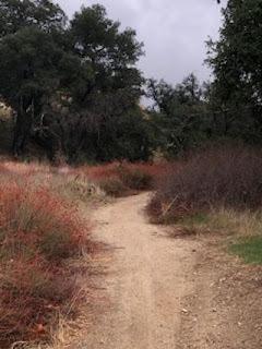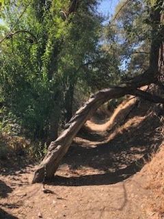 At this point in the trail, I stopped again. In the movies, this is where the mountain lion would be lurking, hanging off that tree trunk bent over the trail. In real life, of course, mountain lions behave like cats, hiding in tall grass and thick brush, blending in--until they pounce with incredible speed and force (unless you have a large dog with you and you're making a lot of noise, which I didn't and I wasn't, so I started singing instead).