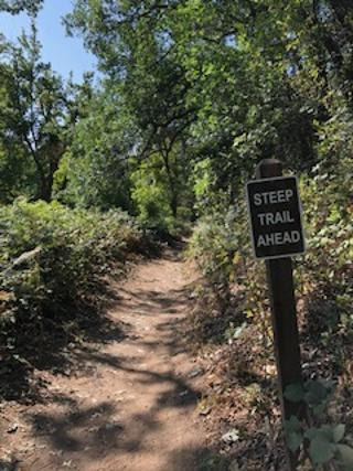 Here's the thing about that sign: Ever come across road signs that say, "Flagman ahead. Prepare to stop" but then you keep driving and see no one for like two miles? Yeah, so, this is like that. The truth is, the trail winds down a very pleasant downhill path. Very pleasant. Very...downhill. So it's easy to keep going, keep wondering what you'll see as you round the next bend. The "steep" part is in the last third of the loop, at which point you reach a set of steps carved into a steep hill and it's just up and up and up for a quarter of a mile. For those of us with holey lungs (and I mean that most literally--hole-y), much panting is required.