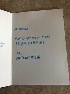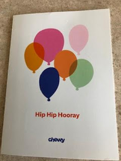 I used to love going into Petco or Petsmart, reading labels, talking to dog and cat rescue volunteers on the weekends, browsing the cat toy aisle. Then the pandemic happened, and at my daughter’s suggestion, I began using Chewy.com. Besides saving me money and allowing me to stay home and stay safe, the folks at Chewy actually sent Thomas a birthday card. How cool is that?