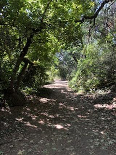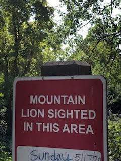 Dear Cousin (because I know you're reading this, looking at this sign, wondering if I'm safe, if I'm crazy), I will admit to pausing for a few minutes before continuing down the trail. Now, I've been down this same trail a time or two or three--but this time was the first time walking the entire trail without my son or my friends or my dog. (No, Thomas wasn't with me, sad to say.) So I stopped to ponder my fate, reflect upon my life, my odds of survival, my need to still take a few risks at this age (66, if you're keeping track), how I might defend myself (hiking stick)--or call for help (cell phone, yep, still got reception). As all this was zinging through my mind, I heard another hiker on the trail, coming from the opposite direction, talking loudly. I saw why when she came into view, saw me with my mask on and paused her conversation to pull hers up. I thanked her, at which point the beautiful gray and white pit bull she had on a leash lunged across the trail at me, wagging his tail furiously, dancing from foot to foot, telling me excitedly "We're doing walks! We're doing walks! I smelled stuff everywhere! I peed everywhere! We're doing good walks!!!!" I petted his head and he slobbered all over my hand, which I accepted as a Holy Dog Anointed Blessing, and I moved on down the trail in the direction they had come up. I mean, let's face it; had there been a mountain lion around, it would have slunk off when Loud Lady and Big Dog showed up.