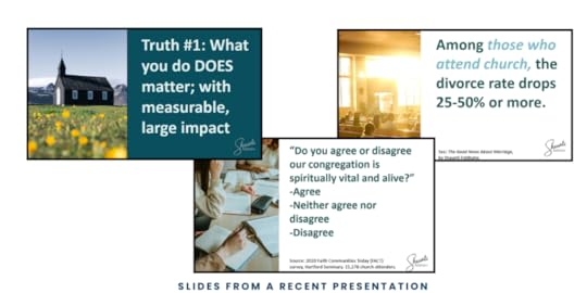 But my favorite statistic of all was this: churches strengthen marriages. What church leaders say from the pulpit, do in discipleship ministries, and say during pastoral counseling sessions is making a much bigger difference than they’ve imagined. Contrary to popularly cited, incorrect data, the divorce rate is not the same in the church as it is in overall culture—it’s not even close. In fact, among those who attend church, the divorce rate drops 25-50% or more.