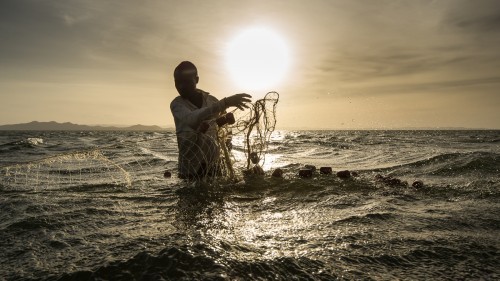 I was swimming in Lake Turkana, just outside of the town of Loiyangalani, Kenya, when I saw this fisherman on the shore mending nets. Lake Turkana, I am told, has the highest concentration of crocodiles in the world, so while the swimming was lovely, this was as good a reason as any to get out. Kura, my Kenyan friend, went over to speak to the young man, Benjamin, while I dried off, put my clothes on, and grabbed my camera. I shot for a few minutes while he mended nets on the shore, before standing up, wrapping his nets on his shoulders and striding into the water. I hadn’t anticipated this. I’d assumed he was done fishing for the day, not beginning. I’d already changed out of my swim trunks so I stripped down to my underwear, put my sandals back on (not the first time I’ve done this, but it’s never pretty) and walked into the waves after him. I’m not sure Benjamin knew what was going on, but he was a good sport about it. He set his nets slowly and paid no attention to me, except to smile occasionally or show concern that I might fall. By now we were chest deep and the waves were kicking up in the wind. I finished shooting and walked towards shore, turning back to wave to Benjamin.