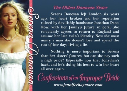 Things have been super busy in the Haymore household, especially on the writing front. I'm so excited about my new series – a trilogy about the five Donovan sisters: Serena, Meg, Olivia, Phoebe and Jessica. It starts with Confessions of an Improper Bride, Serena's story. Check out the cover: