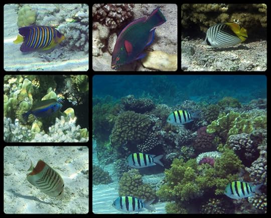 (along the top, from left to right) - Royal Angel Fish, Pygoplites diacanthus; Bicolor Parrotfish, Cetoscarus bicolor; Threadfin Butterfly Fish, Chaetodon auriga.