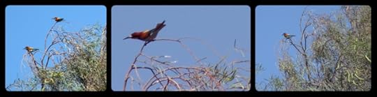 The European Bee-eater, Merops apiaster, flies through Egypt on spring and fall migration. I love waiting for these birds every spring and then alerting my father in Italy, who starts to keep an eye out for his first sighting of the beautiful bee-eaters, usually a few weeks later. The birds in the photos were spotted in Nuweiba, South Sinai yesterday afternoon and I also spotted one in Dahab later in the day. The bee-eaters are more abundant in Cairo so keep your eyes peeled – and listen for their distinctive trill!