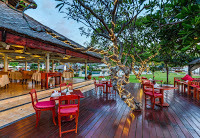 Sitting by the sea within the large complex of Taman Bhagawan, Paon Doeloe is an authentic Javanese Joglo beachfront restaurant located on a vast stretch of Tanjung Benoa's white sand beach. Showcasing elegant colonial-style table settings and pleasurable sofas for a low-key evening, this semi open-air venue is steeped in history and highly appreciates the traditions of the past. Traditional ornaments from Java specifically and vintage décor of the place will travel you back in time while at the same time embrace your present life. Paon Doeloe serves exotic flavours of Indonesian and Asian cuisine in the cosy indoors or under the shades of tree with impressive views of the ocean and a luxurious garden. The beach, garden and culture – such a perfect combination to get all at once.