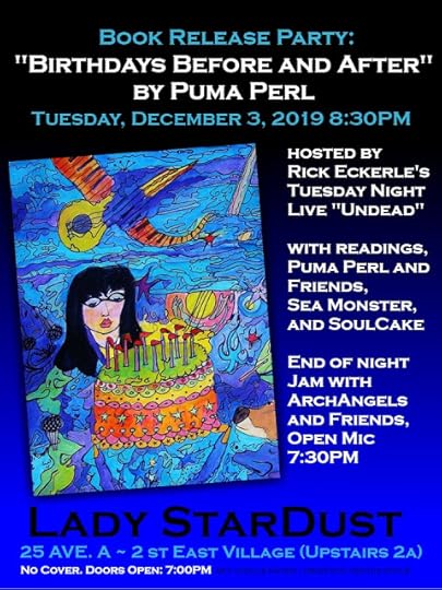 To the edgy, illustrious ranks of poets like Diane DiPrima and Charles Bukowski, let us now add the fearless, delirious genius of Puma Perl. Long a cult legend and staple of the Lower East Side poetry scene, with “Birthdays Before and After,” she steps forward and cements her place as 21st Century visionary and unsparing chronicler of the human condition. Anyone who cares about phenomenal writing and one-of-a-kind breathtaking lines on the page needs to read this book. Puma Perl is nothing short of a national treasure living in our midst. And “Birthdays” is a jewel. Jerry Stahl, Novelist, Memoirist, Screenwriter