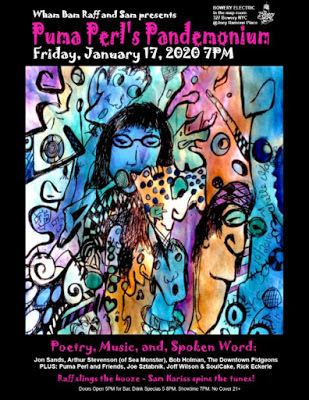 9:00: Puma Perl and Friends - merges spoken word with rock and roll and original music. Friends are Joff Wilson, Joe Sztabnik, Dave Donen, and Danny Ray. “Puma Perl & Friends is art at its best; collaborative, thrilling, and authentic. There is no posturing; it’s poetry & music & its own divine experience.” Elizabeth Grey, Writer https://www.facebook.com/pumaperlandfriends/