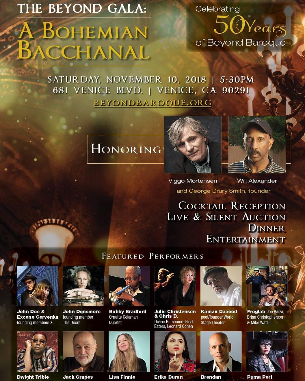 THE BEYOND BAROQUE 50TH BIRTHDAY BOHEMIAN BACCHANAL!I had the honor of being the co-emcee for this fantastic event, which took placeon November 10, 2018, in Venice, California, honoring Viggo Mortensen and Will Alexander with performances by Mike Watt, John Densmore, John Doe and Exene, and more! My co-emcee was Brendan Constantine. Produced by Sharyl Holtzman, thanks to Beyond Baroque Executive Director Richard Modiano for the incredible experience.