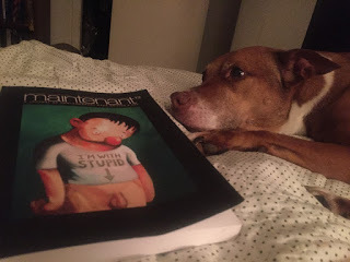 Photo of me by Kat Georges, co-founder and co-editor, with Peter Carlaftes, Three Rooms Press. Beneath is my photo of Diva, the Wonder Dog, meditating on the intricacies of Dada.