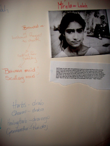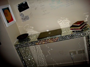 On the left, my bowl of prayer beads, on the right, all my notebooks. I use them as well as wall space!