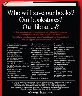 If you follow books, eBooks and publishing you saw the news floating around about the ads James Patterson is paying for to get people talking about bookstores closing and government bailouts. As you know I am not much for talking if it does not result in something being done. So with the smooth pen of one Joel Fishman we, i.e. Joel calls for some action.