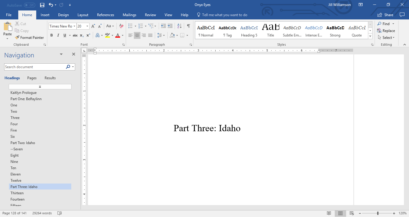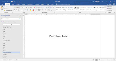 As you can see, I divided my story into chapters, then I divided the chapters of my story into parts, with part two starting between chapters six and seven. I did this by starting each new chapter or part page on a new page break. Then I wrote the chapter number, or "Part Two: Idaho" or whatever the case, selected the text, then chose a heading style. For the part pages, that title is all I'll ever write on those pages. But with the chapter pages, I will write the book after the chapter titles. The words of the book don't show up in the navigation sidebar because I did not choose a special heading for them. The text for your book should be "normal," which it likely is already by default. (FYI, in the image above, Part Three: Idaho has already changed to Part Three: Kenmare. And who knows? It all might change again.)