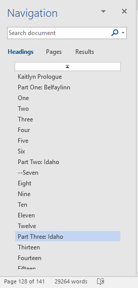 Heading styles are what enable the text to show up in the headings list on the navigation sidebar. I put my part three between chapters twelve and thirteen since that will be my midpoint, then I put my part four between chapters eighteen and nineteen. You don't have to have parts in your book, but I wanted them for this story.