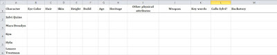 This handy tool is an Excel spreadsheet that allows me to list details I don't want to forget as I move forward with my project. If I don't do this now, I'll waste time as I write, scrolling backwards through my manuscript trying to remember a character's hair and eye color, their stature, nickname, and other defining attributes. The Story Workbook helps me keep everything organized and never more than a click away. Here's a shot of what mine looked like before I started filling it in (click on the image for a larger view).