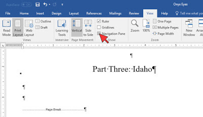 First, I open my story file. Then I need to open the navigation sidebar. To find it, click on the "View" tab, then click the little box that says "Navigation Pane," which is in the left center of the toolbar under the "Ruler" and "Gridlines" boxes. Here is an image to help you find it: