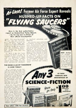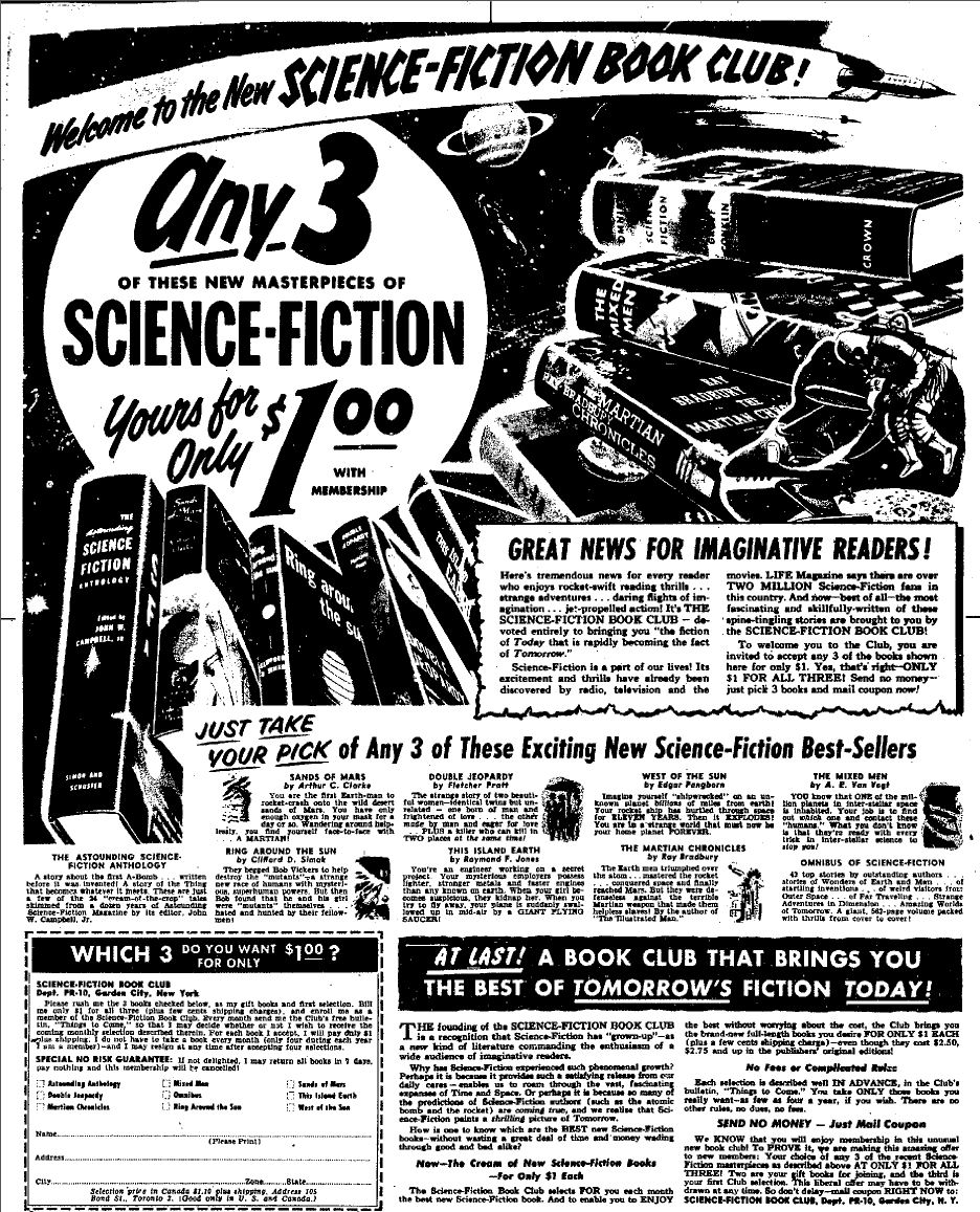I was pretty young when I discovered an ad for the Science Fiction Book Club, probably on the back cover of one of the many science fiction magazines I was reading at the time. There were more than a dozen SF magazines on the racks then, both major and minor, original and reprint. I don't remember how old I was or the name of the magazine in which I found the advertisement, but I do recall the title of the first book I ordered--A Treasury of Great Science Fiction, in two volumes, which I still have, though the covers did not fare as well as the books in my many moves across the country and around the world. I also remember taping the dime in place, folding over the flap and filling all the information requested on those much-too-tiny lines. When I received the two-volume anthology, I devoured it, and even now I read the stories in it from time to time. I still consider it one of the two best SF anthologies ever published, the other being Adventures in Time & Space. I love anthologies, but Treasury was not just another anthology for me. It was a key to other worlds, both future and past. Since it was a science fiction anthology, it mostly addressed the future of humanity on other planets as well as in deep space, but it also collected a kind of science fiction that was then fading from the scene in favor of a "new wave" of SF. Today, the stories and their language must seem quite alien (code word for quaint, dated or non-PC) to modern readers.I lived in Chula Vista, a town set securely between San Diego and the Mexican border, a town most people barely notice as they pass through it to or from TJ. When I moved there, the population was 40,000-50,000 people, and we lived in a newly developed area that had once been strawberry fields. My parents paid $1 down, and the house itself was just $23,000. If nothing else, that will give you an idea what that dime was worth. I didn't know it at the time, but the SFBC was only about a decade old. It was founded in 1953 by publisher Doubleday. Like many other book clubs of the day (Detective, Mystery Guild, etc) the SFBC had its own presses and could offer hardcover editions at greatly reduced prices. Where I lived, I could get magazines, comics and pocketbooks at the dime story (Woolworth's or TG&Y) or drug store (Thrifty's...best ice cream around), but hardcovers were another story.