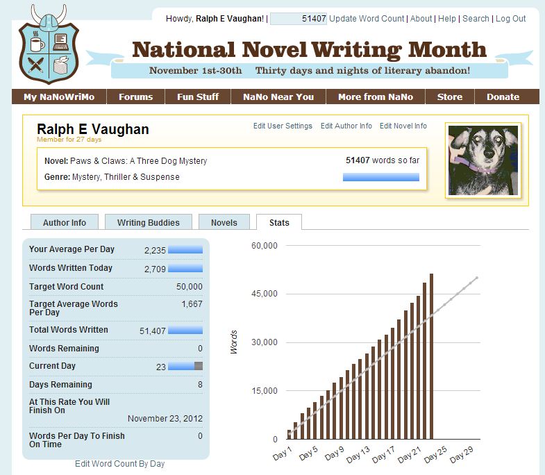 At the beginning, I did not think I could do it, especially as the midnight hour approached, but I did. I began work on Paws & Claws: A Three Dog Mystery at 12:01 AM on 1 November 2012; by 2:40 PM on 23 November 2012, I finished typing the last word, "dawning," word number 51,408. The point of all of this, however, is not that I can do it but that you can do it. If you have ever thought, I would like to write a novel, but I don't think I can go it alone, then the structure and encouragement (with its numerous pep talks) of NaNoWriMo may be way you need. Go to the website and plan for 2013. You can do it. I did.